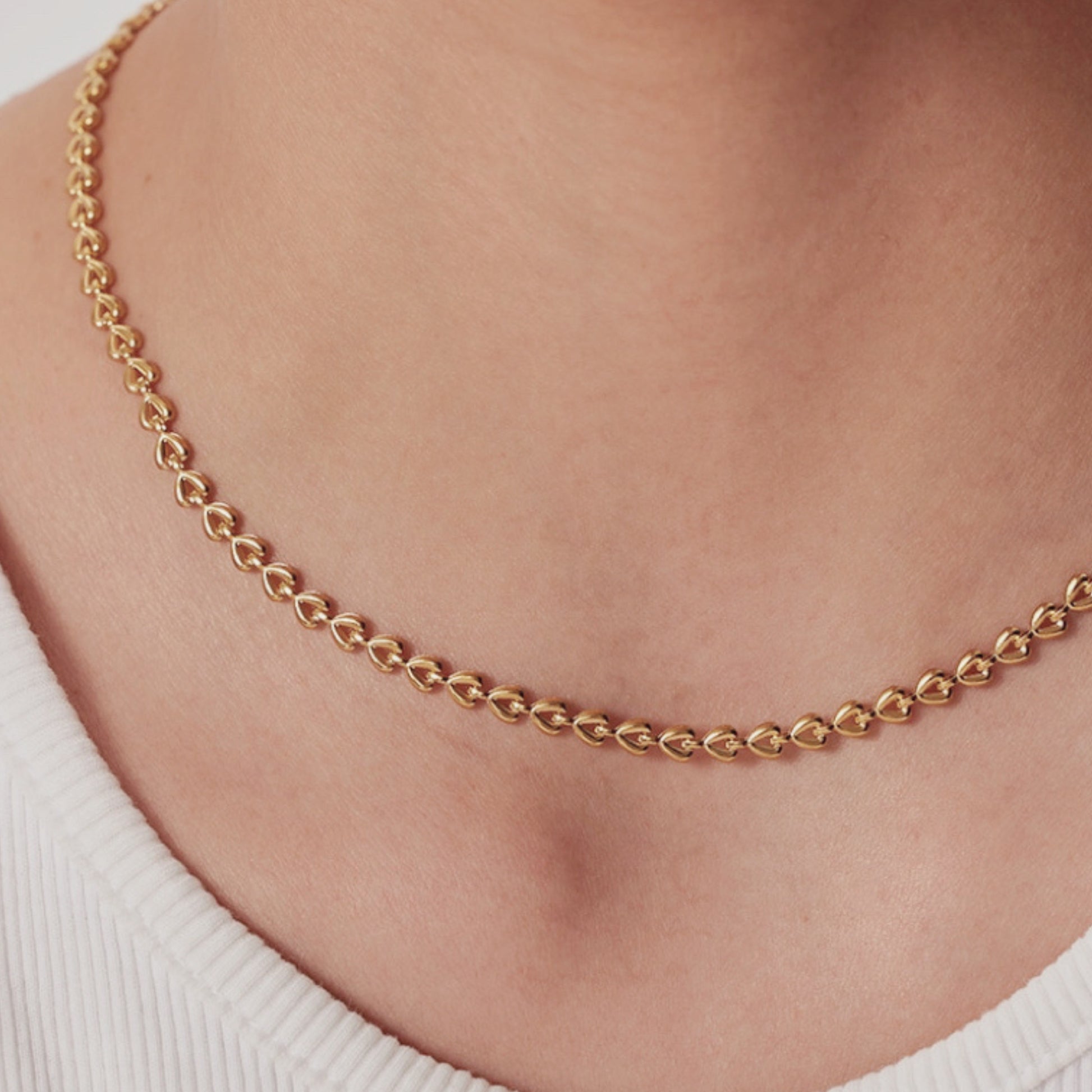 Accentuate your look with our Chain of Hearts Necklace, an exquisite piece that reflects the sentiment of love and connection. Each heart is intricately linked together to form a mesmerizing chain, symbolizing unity and affection. Meticulously designed with exquisite detail, this necklace radiates refinement and grace, becoming an enduring piece in your jewelry assortment. Let the Chain of Hearts Necklace rest near your heart and let its radiant beauty illuminate your style.