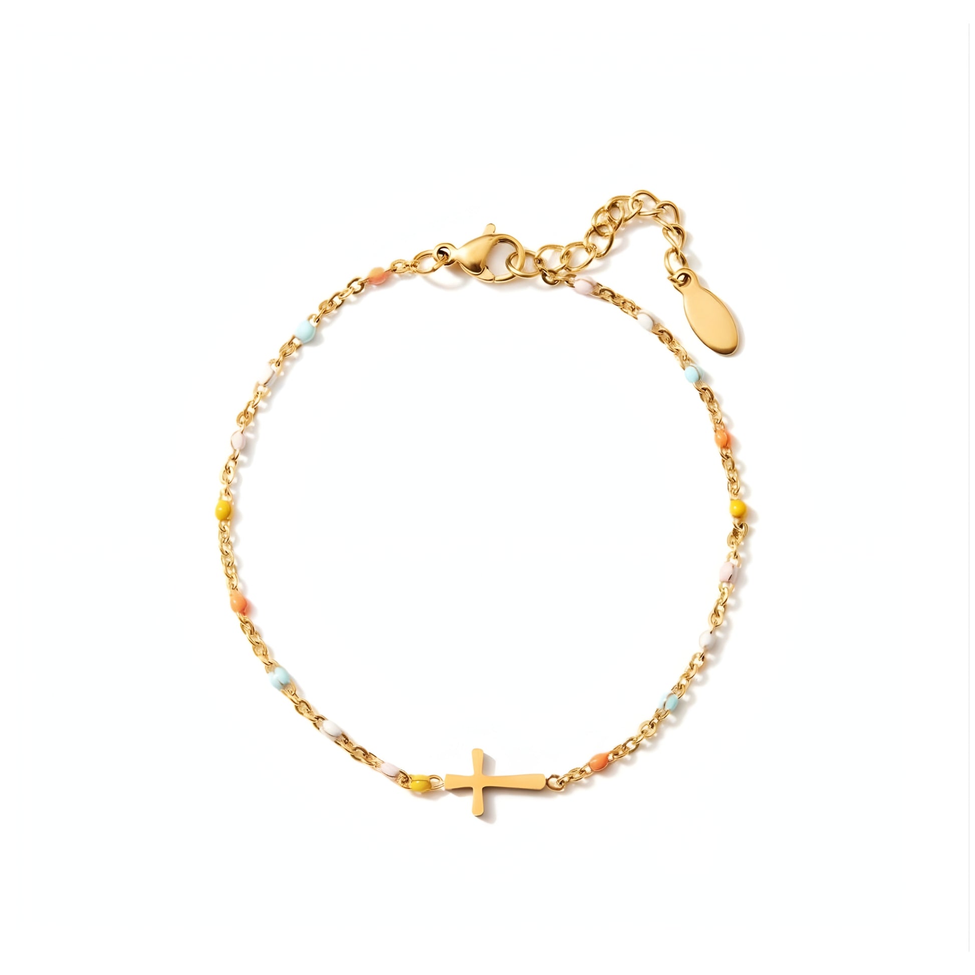 Featuring a minimalist cross silhouette intertwined with a spectrum of delicate, multicolored beads, this piece serves as a poetic reminder that even the smallest spark of faith can brighten the world around you. It is a tangible vessel for your personal story—an emblem of hope to wear every day.