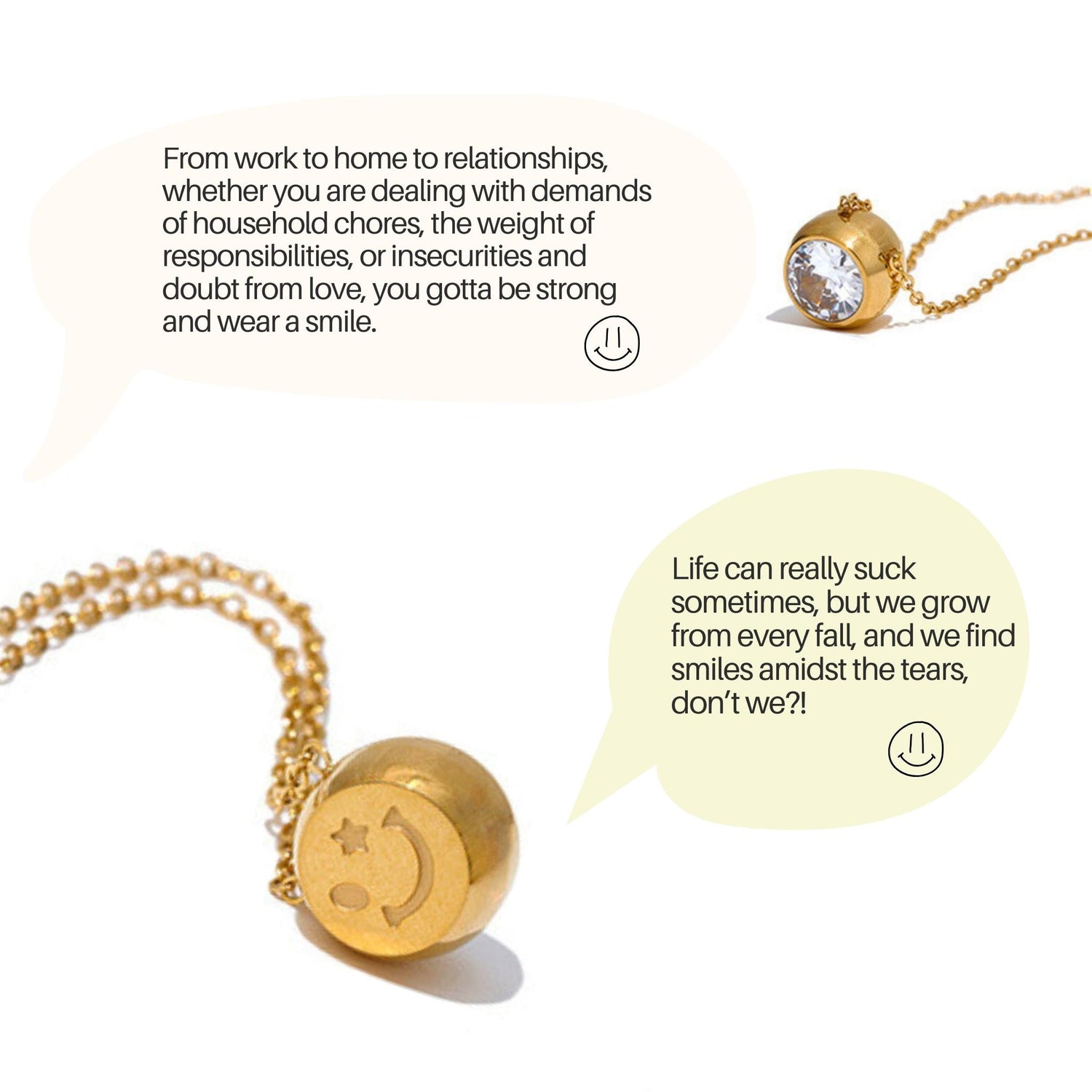 Introducing our "No One Wants To See You Cry" Necklaces, a symbol of resilience and positivity. This stainless steel 18K gold plated necklace features a pendant with two sides: a charming smiley face that radiates happiness and a sparkling zircon gemstone. Wear the smile to inspire joy and strength, and the gemstone as a reminder to shine bright through life's challenges. Embrace the message that your smile is your power, and with it, you can overcome anything. Let this necklace be a daily affirmation to keep smiling and shining your light.